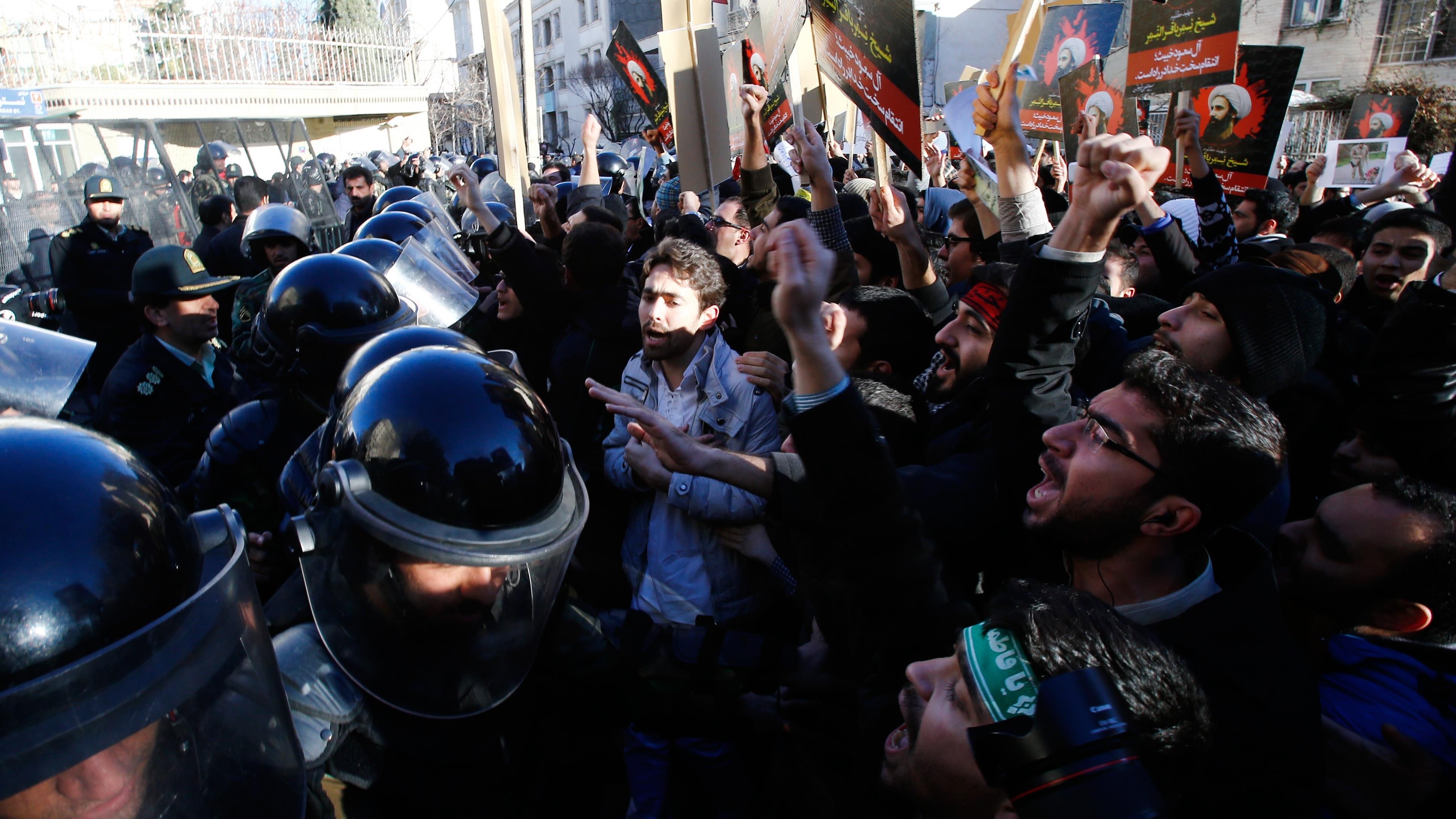 En la República Islámica de Irán, los indignados atacaron los edificios de las sedes diplomáticas saudíes en Teherán (capital) y Mashad (noreste) —acto calificado por el Gobierno iraní de inaceptable—.