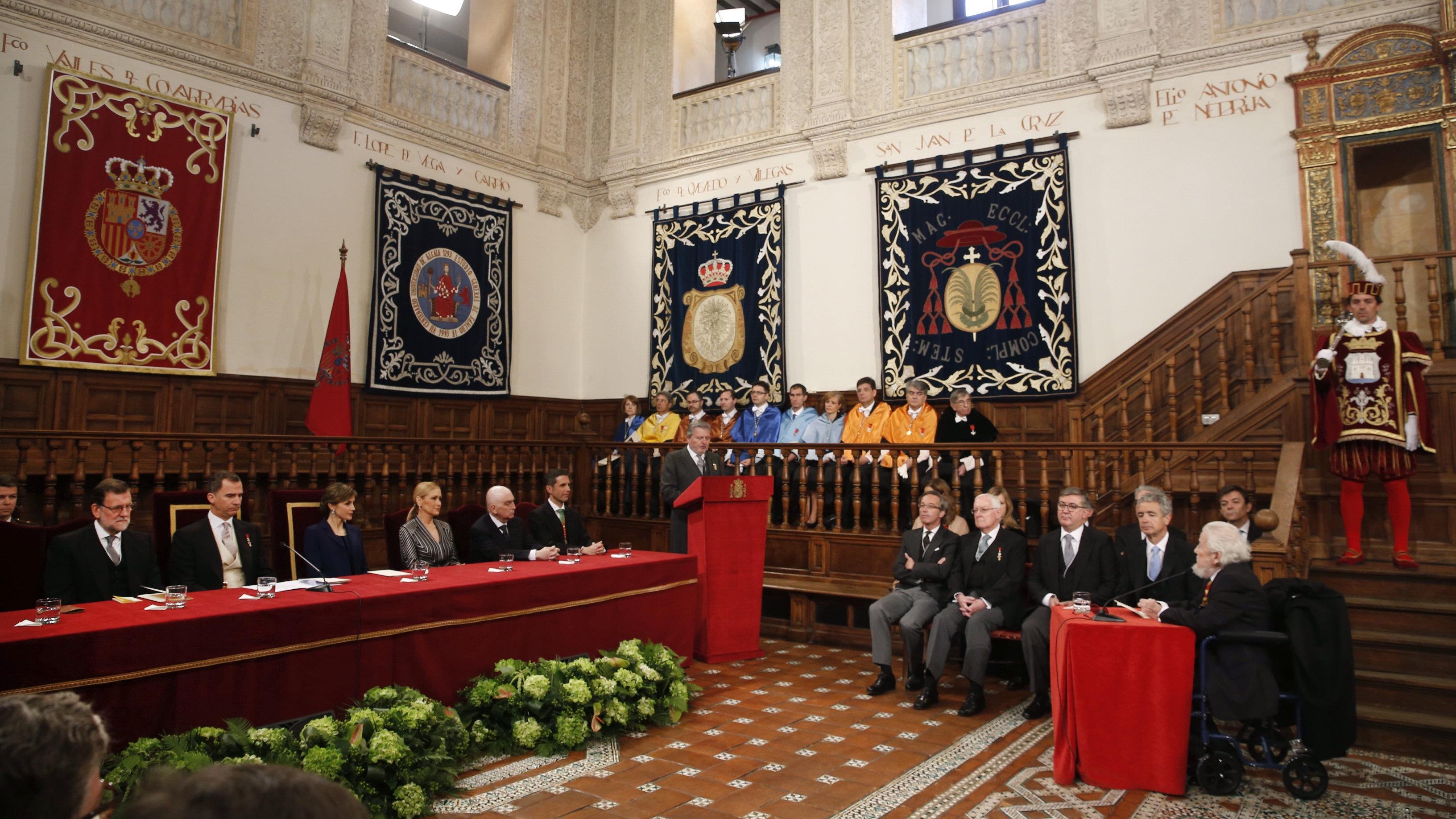 El escritor hizo aflorar las risas en los asistentes al acto, presidido por los reyes Felipe y Letizia, entre los que estaba el jefe del gobierno en funciones, Mariano Rajoy, y el secretario (ministro) de Cultura mexicano, Rafael Tovar.