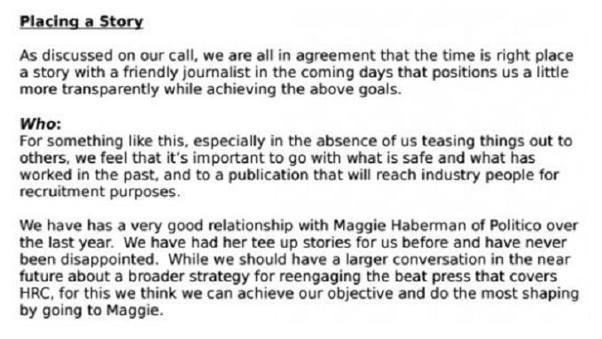 En este sentido, Nick Merrill, secretario de prensa de campaña de Clinton, escribió una nota a Haberman para sugerirle qué debería publicar y, al mes siguiente, la reportera publicaba dos historias sobre la candidata demócrata, ambas estaban muy trabajadas, matizadas e incluso mejor que el memorándum original.