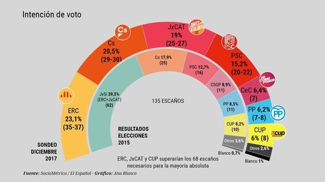 A veinte días de las elecciones regionales del 21 de diciembre, un sondeo elaborado por la empresa SocioMétrica y difundido este sábado por el portal El Español, revela que la lista de la candidatura Junts per Cataluña (Juntos por Cataluña, JxCAT) que lidera Puigdemont crece a marchas forzadas, de tal manera que lograría en las urnas el 19 % de los votos y entre 25 y 27 escaños.