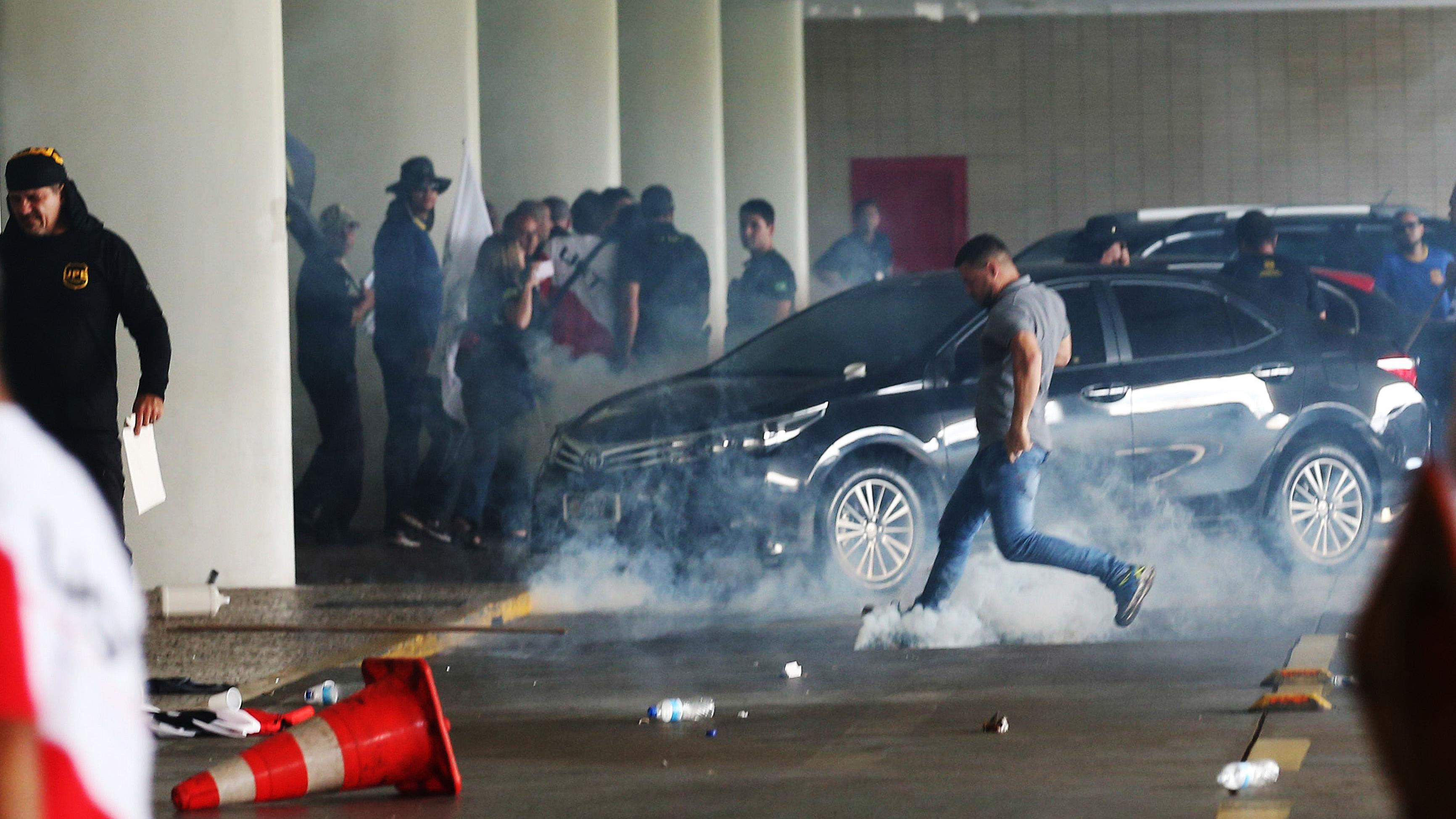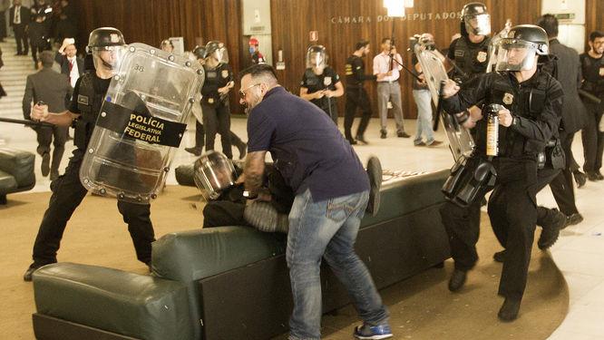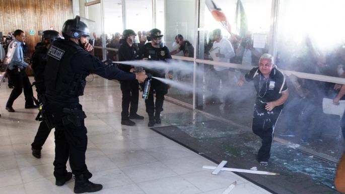 Los miembros de la Policía Legislativa intentaron impedirlo y se generaron incidentes en los que se rompieron algunas puertas de cristal y los manifestantes fueron reprimidos con gases lacrimógenos y pimienta en pleno salón de entrada al Congreso.