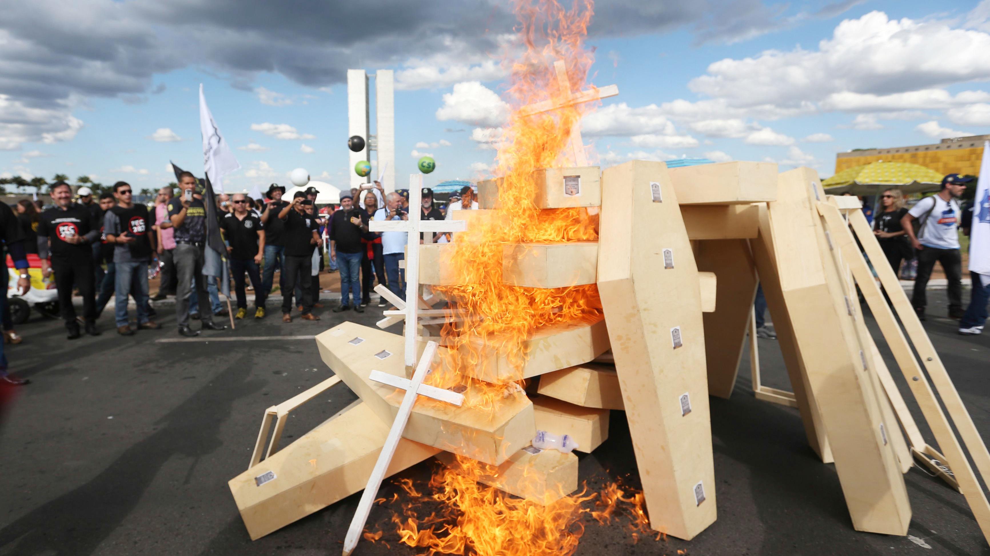 La protesta fue convocada contra una de las principales reformas del Gobierno de Michel Temer, que apunta a aumentar la edad mínima para la jubilación, y discurrió de forma pacífica hasta que un grupo de manifestantes intentó ingresar por la fuerza a la sede del Parlamento en Brasilia, la capital de Brasil.