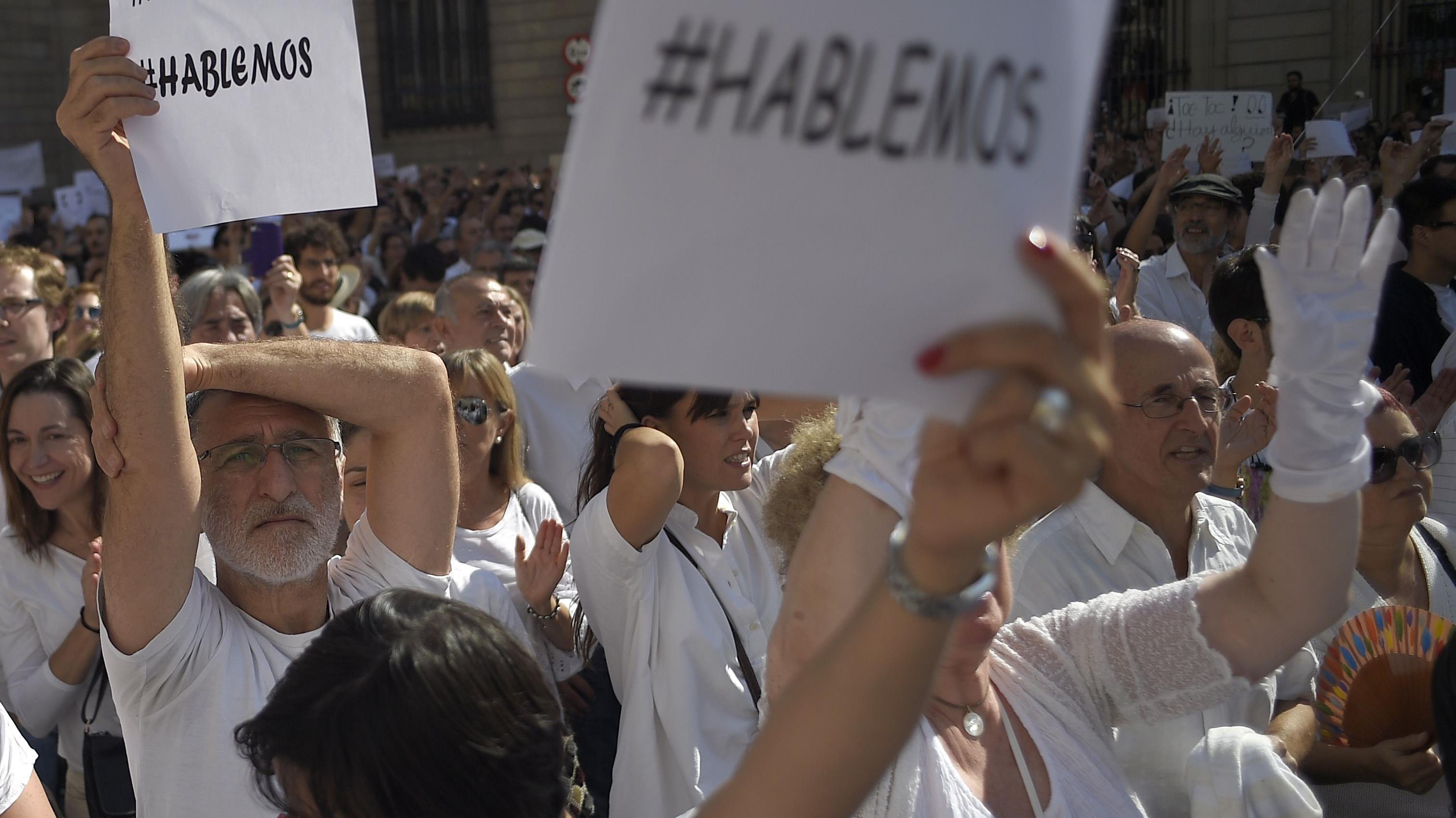 Los manifestantes han acudido a las marchas convocadas por 'Parlem/Hablemos' vestidos de blanco y portando banderas del mismo color. Con el lema “menos odio y más conversación”, miles de personas han desplegado una bandera blanca que insta a la negociación entre el Govern (Gobierno catalán).
