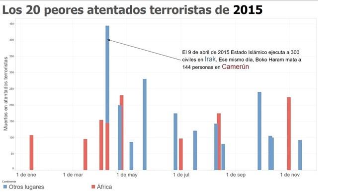 Del mismo modo, la mitad de los atentados que más víctimas mortales han causado el pasado año se produjo en territorio africano.