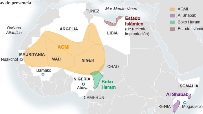 Conforme a expertos, Libia, Mali, Nigeria y Somalia son hoy los principales bastiones del extremismo africano, que si bien se encuentra extendido como nunca antes, también está dividido entre Al-Qaeda y el EIIL (Daesh, en árabe), que pugnan por la hegemonía del terrorismo. Es a la luz de esta rivalidad como deben interpretarse los episodios de violencia terrorista que vienen teniendo lugar en África en los últimos años.