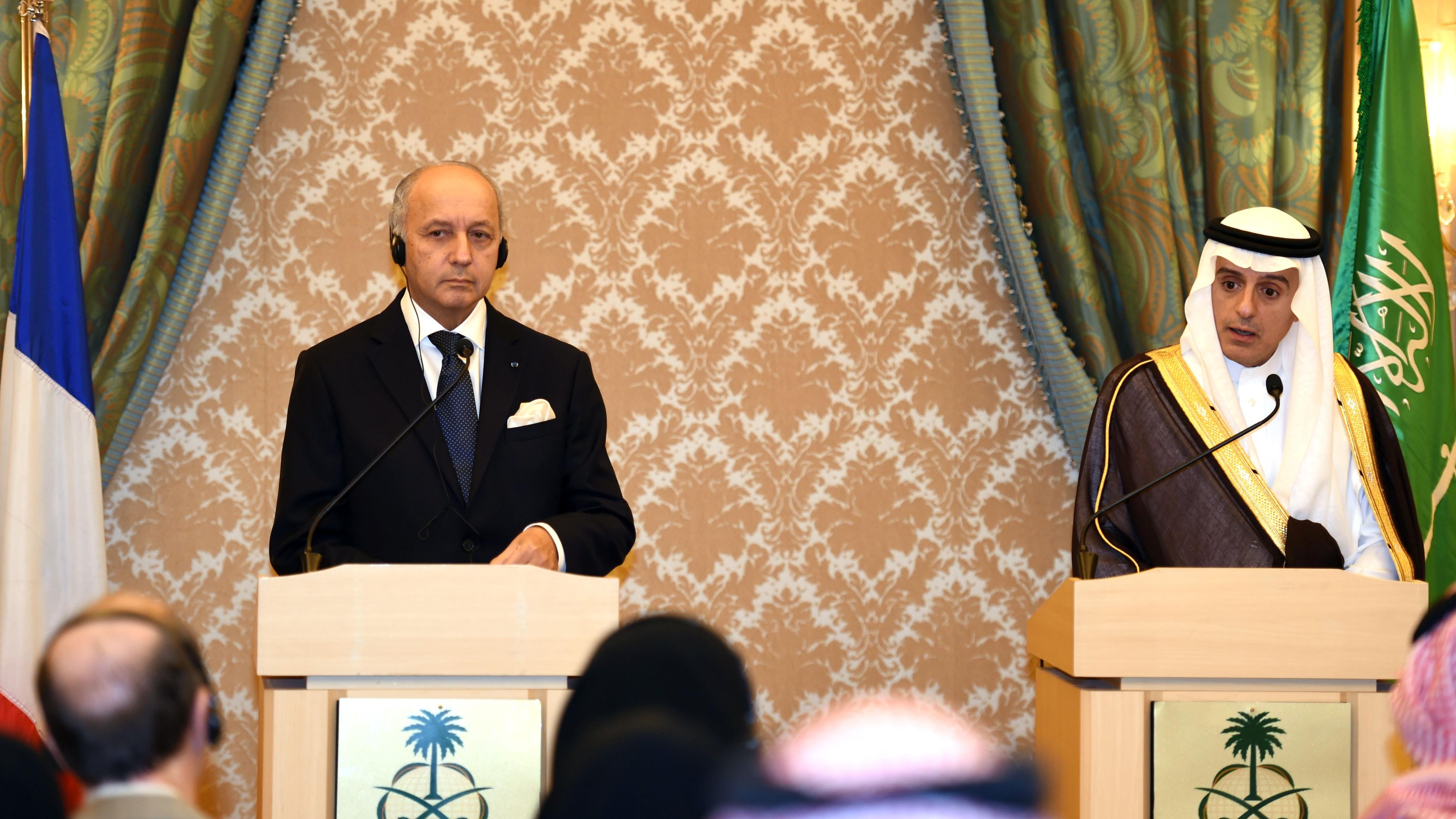 El ministro de Exteriores de Arabia Saudí,  Adel al-Yubeir (drch.) y su homólogo francés, Laurent Fabius, en una rueda de prensa conjunta en Riad, capital saudí, 13 de octubre de 2015.