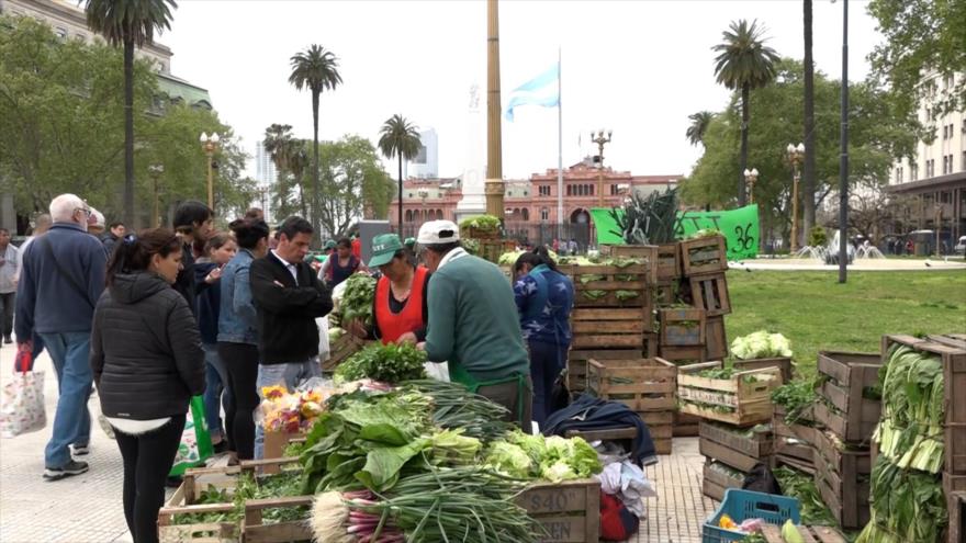 Lo que parece una feria de frutas y verduras, es en realidad una protesta contra las políticas económicas que erradicaron a los pequeños productores en beneficio de la especulación.