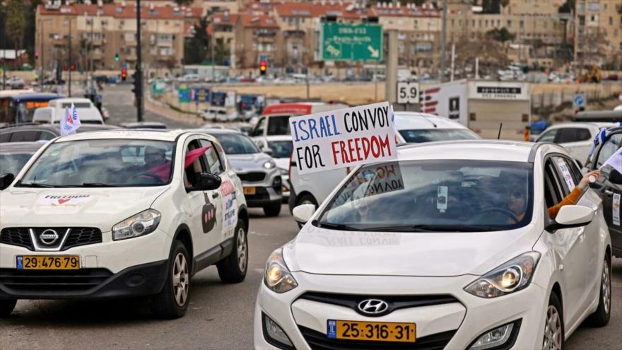 Los manifestantes antivacunas israelíes hicieron sonar las bocinas de sus autos y ondearon banderas canadienses e israelíes mientras se dirigían hacia la sede del parlamento israelí. Los manifestantes portaban carteles en contra del uso de mascarillas y otras restricciones por el coronavirus.