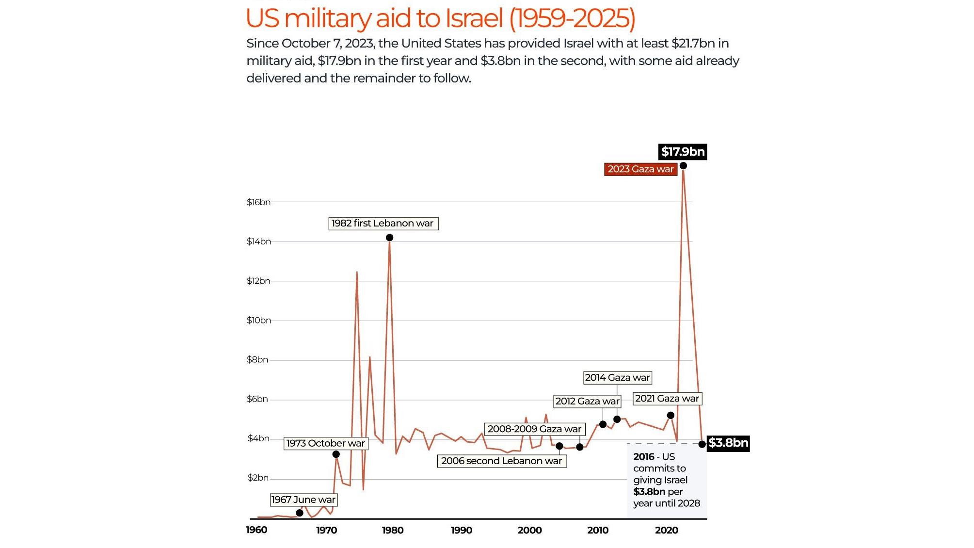 Gráfica elaborada por Al Jazeera muestra datos del Cost of War sobre la evolución de la ayuda militar estadounidense a Israel entre 1959 y 2025.