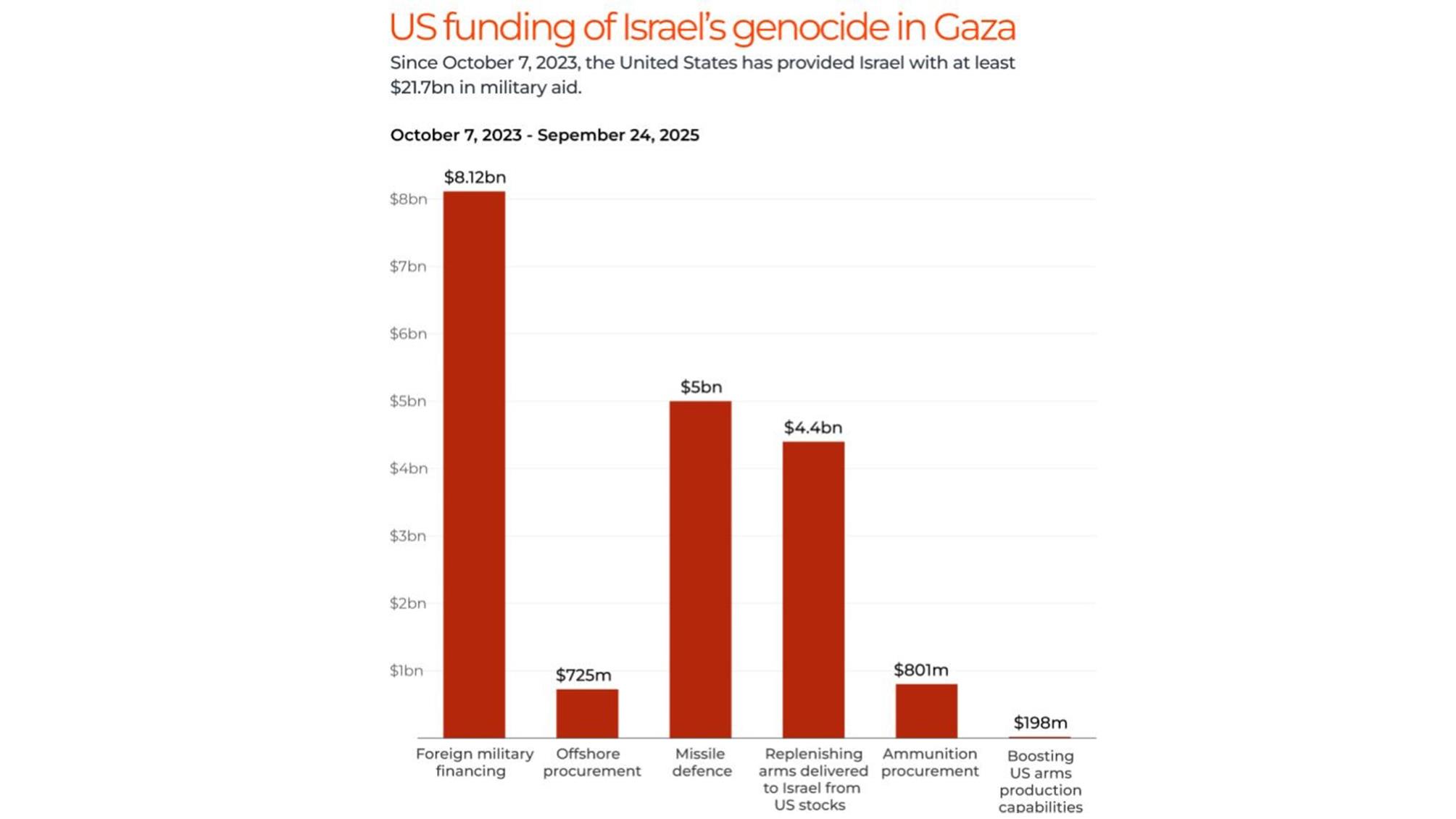 Según datos del proyecto Costo of War, publicados por Al Jazeera Labs, entre el 7 de octubre de 2023 y el 24 de septiembre de 2025, Estados Unidos ha entregado al menos 21.7 mil millones de dólares en asistencia militar a Israel.