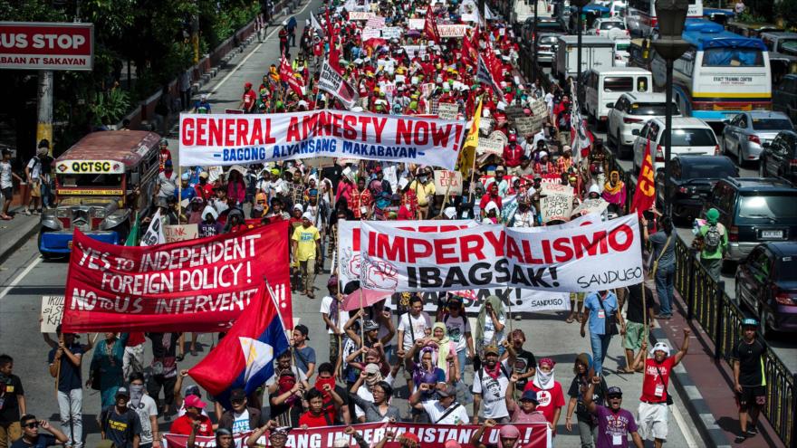 Los manifestantes marcharon el viernes a lo largo de tres kilómetros hasta el palacio presidencial en Manila para exigir el fin del "dominio del imperialismo" en su país, una antigua colonia estadounidense que consiguió su independencia en 1946.