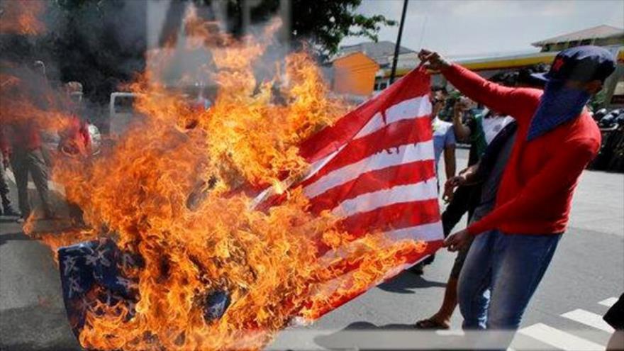 Los manifestantes se han congregado este domingo frente a la embajada de EE.UU. en Manila (capital filipina) con pancartas en las que se podían leer lemas, como “Expulsen a Trump”, y han quemado la bandera estadounidense con la imagen del inquilino de la Casa Blanca.