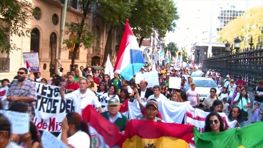 Cientos de migrantes marchan por las calles de Buenos Aires para repudiar las políticas xenófobas y discriminatorias del gobierno argentino.