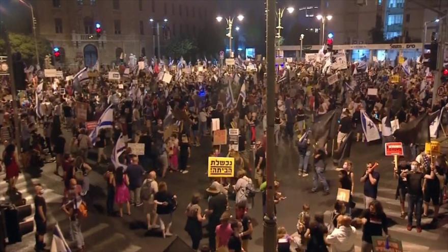 1- Miles de israelíes vuelven a protestar contra el primer ministro Benjamín Netanyahu, por corrupción y la mala gestión de la crisis de la pandemia del nuevo coronavirus, causante de la COVID-19.