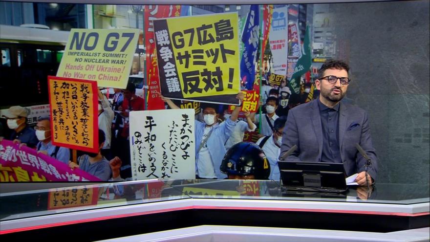 2. En Japón, se manifiestan contra la presencia del presidente de Estados Unidos, en su país en el marco de la Cumbre del G7. Advierten sobre las alianzas militares que Washington busca formar con su país.