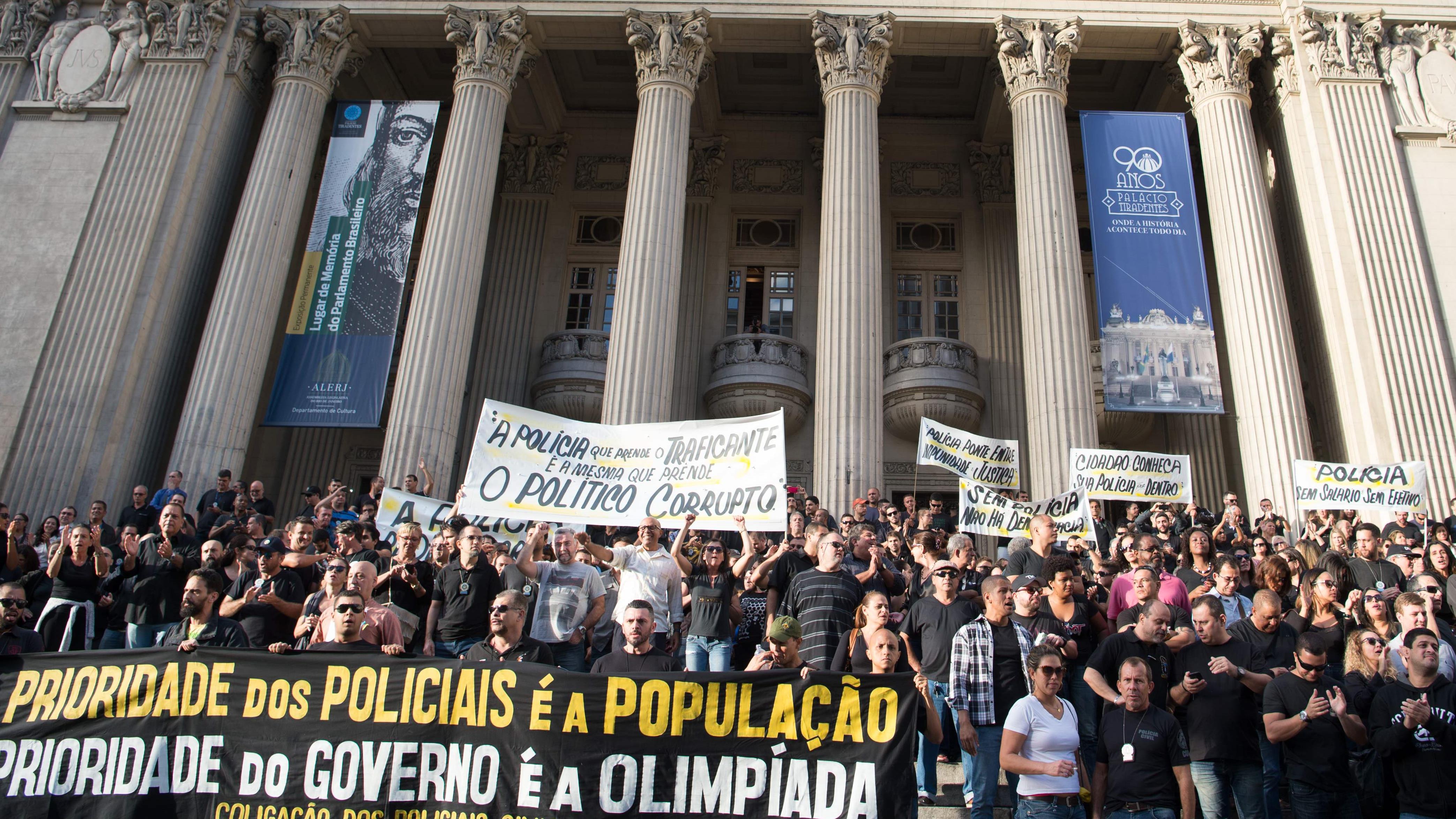 Unos 300 miembros de la policía civil, que ejercen funciones judiciales, marcharon el lunes vestidos de negro hasta la sede de la Asamblea Legislativa del estado de Río de Janeiro, donde denunciaron el “abandono” que sufren por parte del gobierno regional. En la manifestación, decenas de policías exhibían pancartas con inscripciones como “Olimpiadas con policías sin salarios”.