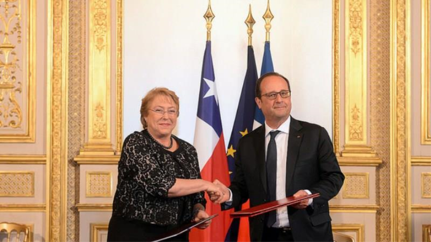 En el palacio del Elíseo, en París, capital francesa, Bachelet y Hollande firmaron diferentes acuerdos sobre aspectos del quehacer político, social y económico, con el fin de generar nuevas instancias para impulsar el desarrollo de ambos países.
