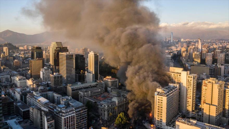 Un total de 17 compañías de bomberos de Santiago asistió para apagar las llamas, a cuatro cuadras de la sede presidencial, el Palacio de La Moneda, hasta donde intentaban acercarse miles de manifestantes.