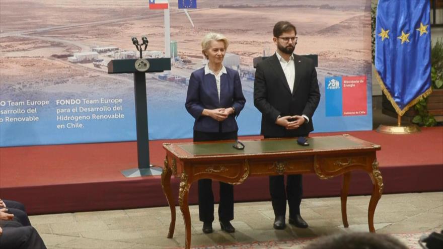 La presidenta de la Comisión Europea, Urusula Von der Leyen, en Chile, en la tercera parada de su gira por Latinoamérica. En su agenda, la inversión por energías renovables. La funcionaria europea firmó con el presidente Gabriel Boric, dos acuerdos para el desarrollo del hidrógeno renovable en Chile.