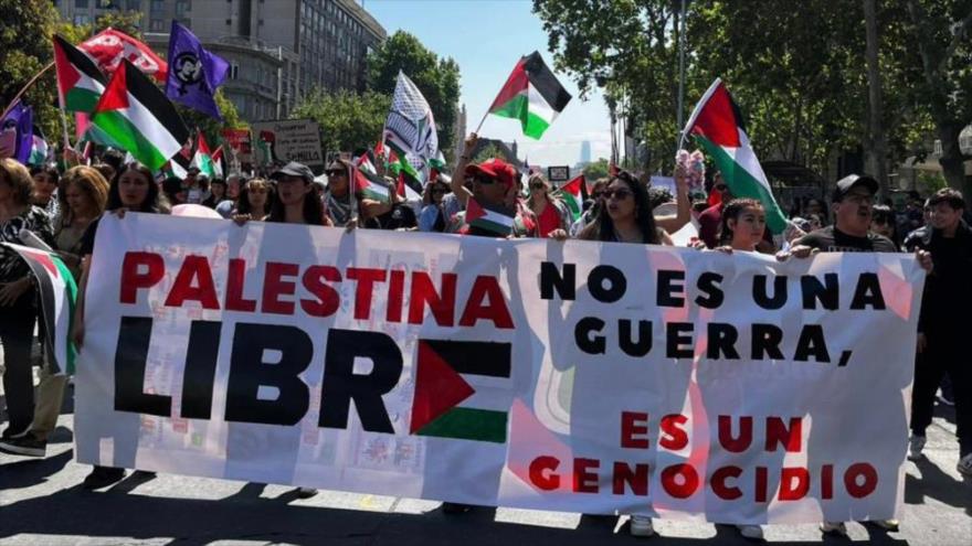 Bajo el lema #ChileNoApoyaGenocidios, los manifestantes que fueron convocados a la marcha por los grupos propalestinos en las redes sociales, han instado al Gobierno chileno a dejar los lazos de amistad con el régimen sionista.