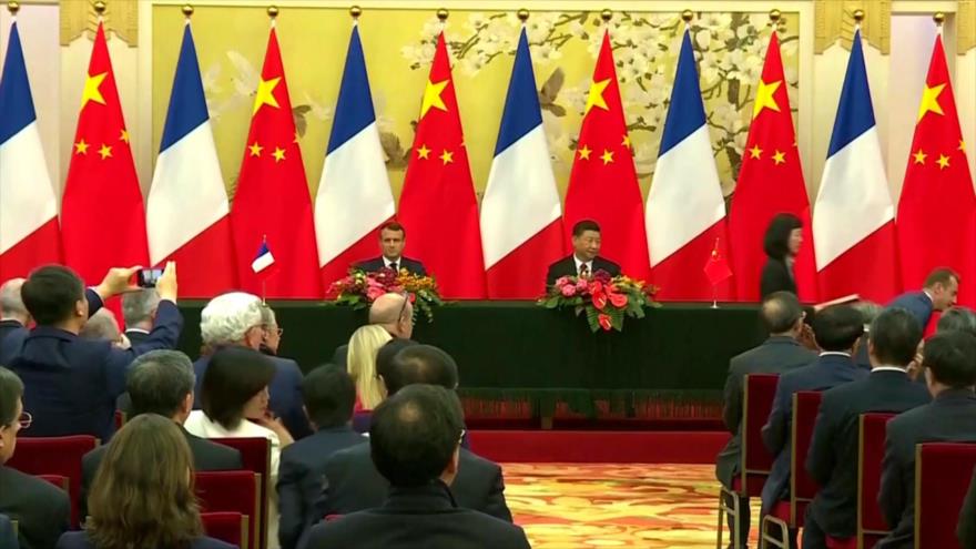 El presidente de Francia, Emmanuel Macron, y su par de China, Xi Jinping, unidos ante un mal que afecta a todo el planeta: el cambio climático.