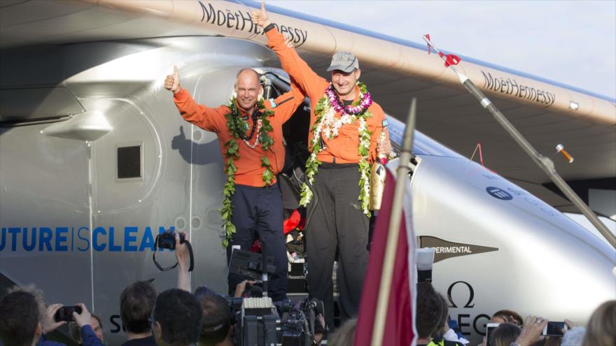 Después del aterrizaje del avión, el piloto Bertrand Piccard, ha sido recibido afuera de la cabina por su socio y compañero piloto del Solar Impulse, André Borschberg. Ambos se abrazaron y agitaron sus puños en el aire.