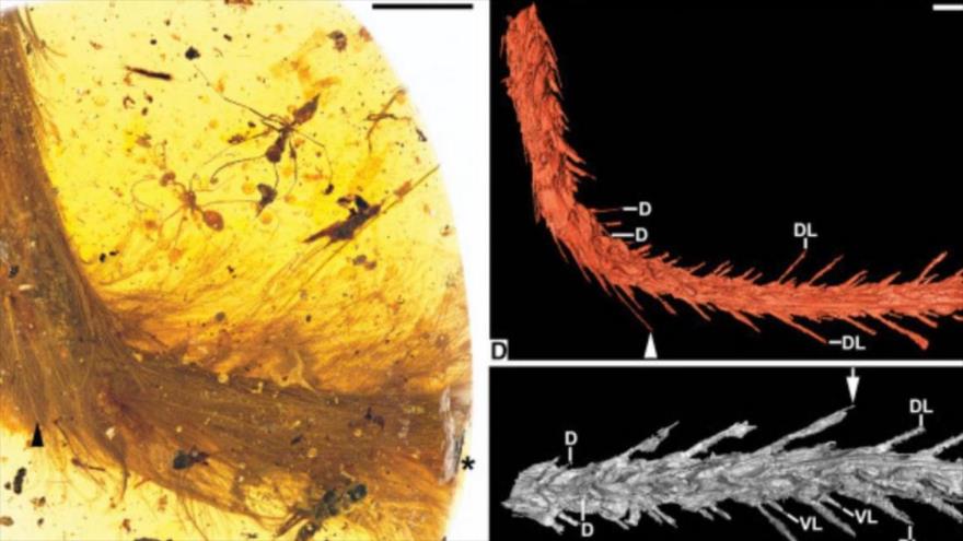 Tras estudiarlo junto a su equipo y otros investigadores de Canadá y el Reino Unido, han concluido que el trozo de ámbar ha conservado una cola con plumas de un dinosaurio de 99 millones de años, un hallazgo que analizan en la revista Current Biology.