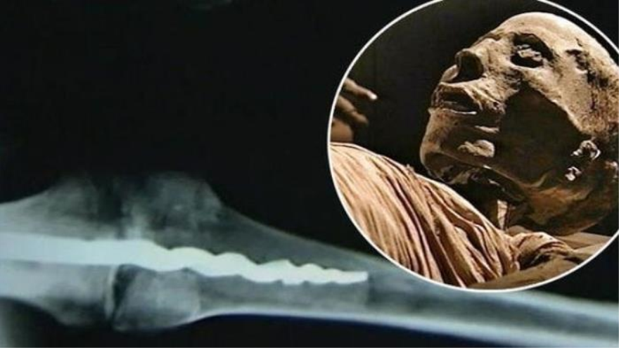 El diario Daily Express señaló que el cirujano Richard Jackson encontró dentro de una momia con 3000 años de antigüedad un tornillo ortopédico de hierro de unos 23 centímetros.