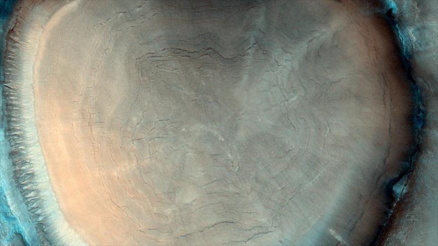 La Agencia Espacial Europea (ESA, por sus siglas en inglés) ha capturado una imagen peculiar del interior de un cráter de Marte con un extraño parecido al tocón de un árbol con anillos concéntricos como los que determinan la edad en los troncos de los árboles ofreciendo un panorama orbital del interior de dicho cráter lleno de depósitos, probablemente ricos en hielo de agua.