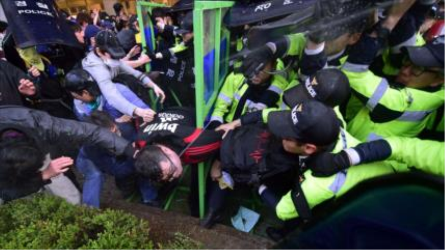 La agencia de noticias estatal surcoreana Yonhap ha informado de la detención de 20 personas en la protesta, mientras los efectivos de policía han utilizado cañones de agua y aerosol de pimienta para dispersar a los manifestantes.