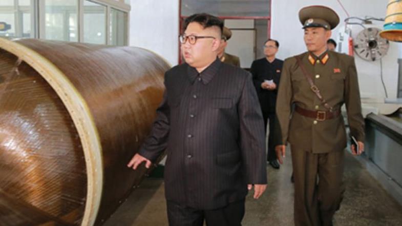 En otra imagen publicada por los medios norcoreanos, Kim pasa al lado de un gran contenedor de cobre, que según los expertos podría ser la carcasa plástica de un misil reforzada con un filamento enrollado.