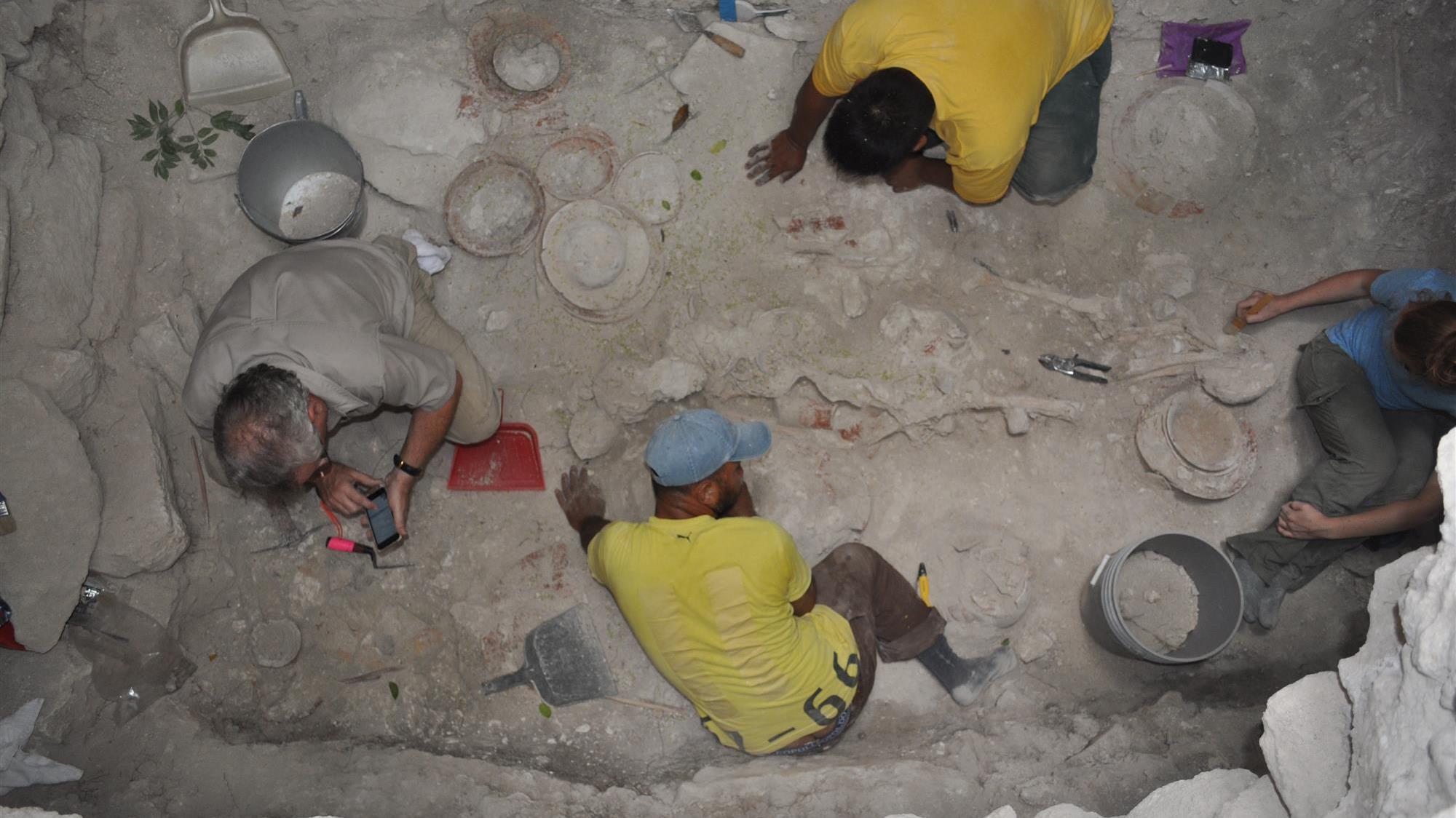 En la base de la escalinata del edificio se han descubierto dos escondrijos con ofrendas y a mitad de la escalera se encontraba la tumba con los restos de un individuo adulto.