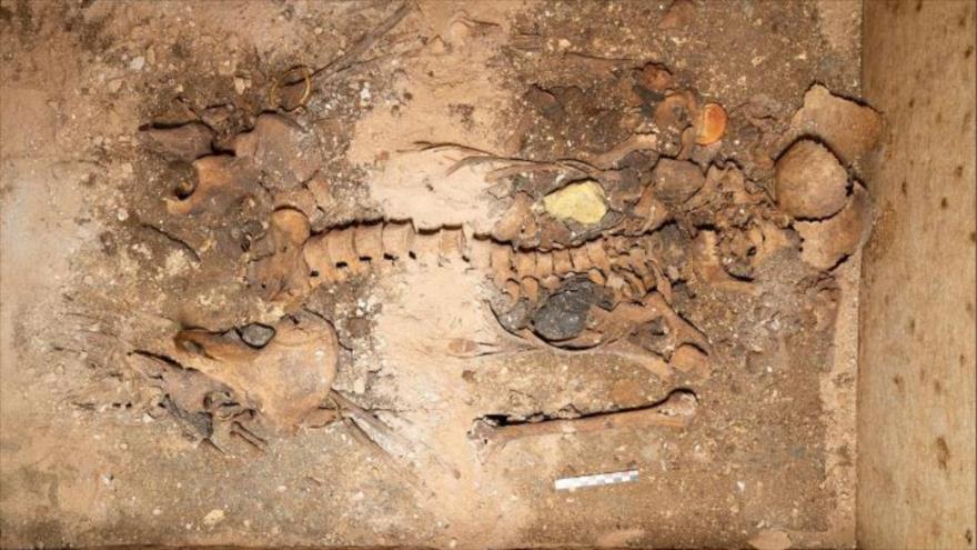 En el sarcófago fueron encontrados pulseras, anillos y un gran collar de oro, una hebilla con forma de mujer, vasos de cristal y metal y fragmentos de la ropa de la difunta.