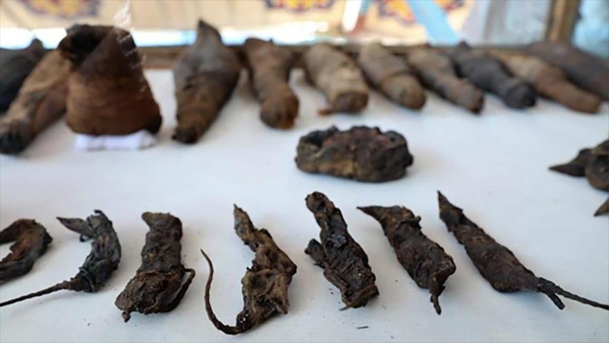 En la sala de enterramiento, se hallaron dos ataúdes, en uno de ellos una momia de mujer de entre 35 y 50 años, mientras que, en el otro, un niño de entre 12 y 14 años, ambos también en buen estado de conservación, mientras más de 50 ratones momificados, así como gatos y aves, se encontraron rodeando los dos cuerpos humanos.