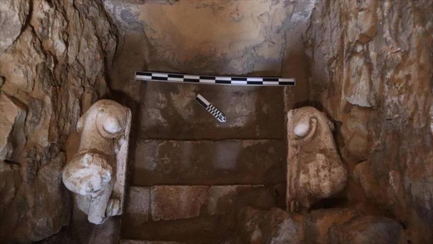 Se trata de una edificación construida en lodo y ladrillos, con una escalera interna y una cámara tallada en piedra caliza que contiene una placa grabada con diversas figuras, además de inscripciones griegas, agrega el texto, antes de aseverar que también se hallaron dos estatuas en forma de leones, hechas de piedra caliza y de aproximadamente 55 centímetros de altura.