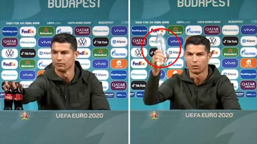 Cristiano al sentarse en la sala de prensa oficial de la Eurocopa en Budapest, la capital húngara, mirando de reojo dos botellas de Coca Cola colocadas en la mesa, las coge con cierto desdén y las retira del primer plano. A continuación, muestra una botella de agua y remata con un: “Agua, no Coca-Cola […]”.