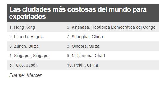 Después de las cinco primeras de la clasificación, Kinshasa (República Democrática del Congo), Shanghái (China), Ginebra (Suiza), Yamena (Chad) y Pekín (China) completan las diez ciudades más caras para los expatriados, con Nueva York como undécima clasificada.