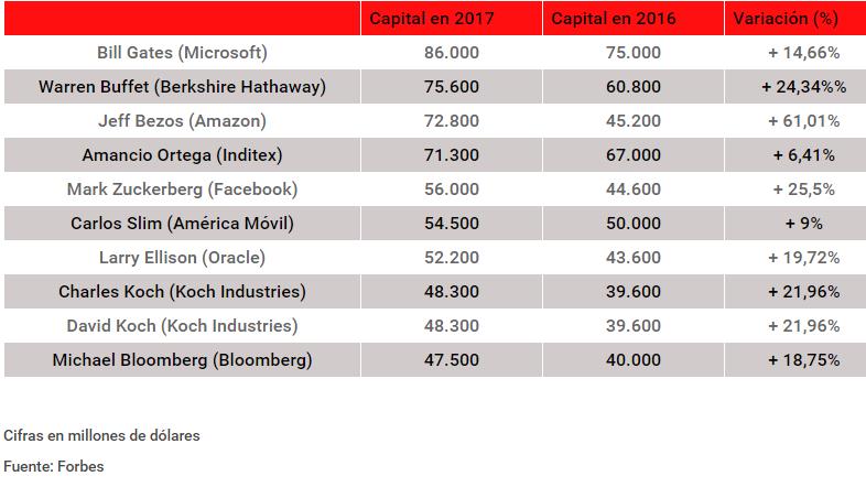 El fundador de Oracle, Larry Ellison, se mantiene en séptimo lugar del listado con una fortuna de 52.200 millones de dólares (48.530 millones de euros), un 19,7 % más que en 2016, mientras en octavo lugar empatan Charles Koch y David Koch con una fortuna de 48.300 millones de dólares (44.899 millones de euros), un 22 % más. Cierra las diez primeras posiciones Michael Bloomberg con 47.500 millones de dólares (44.155 millones de euros), un 19,75 % más.