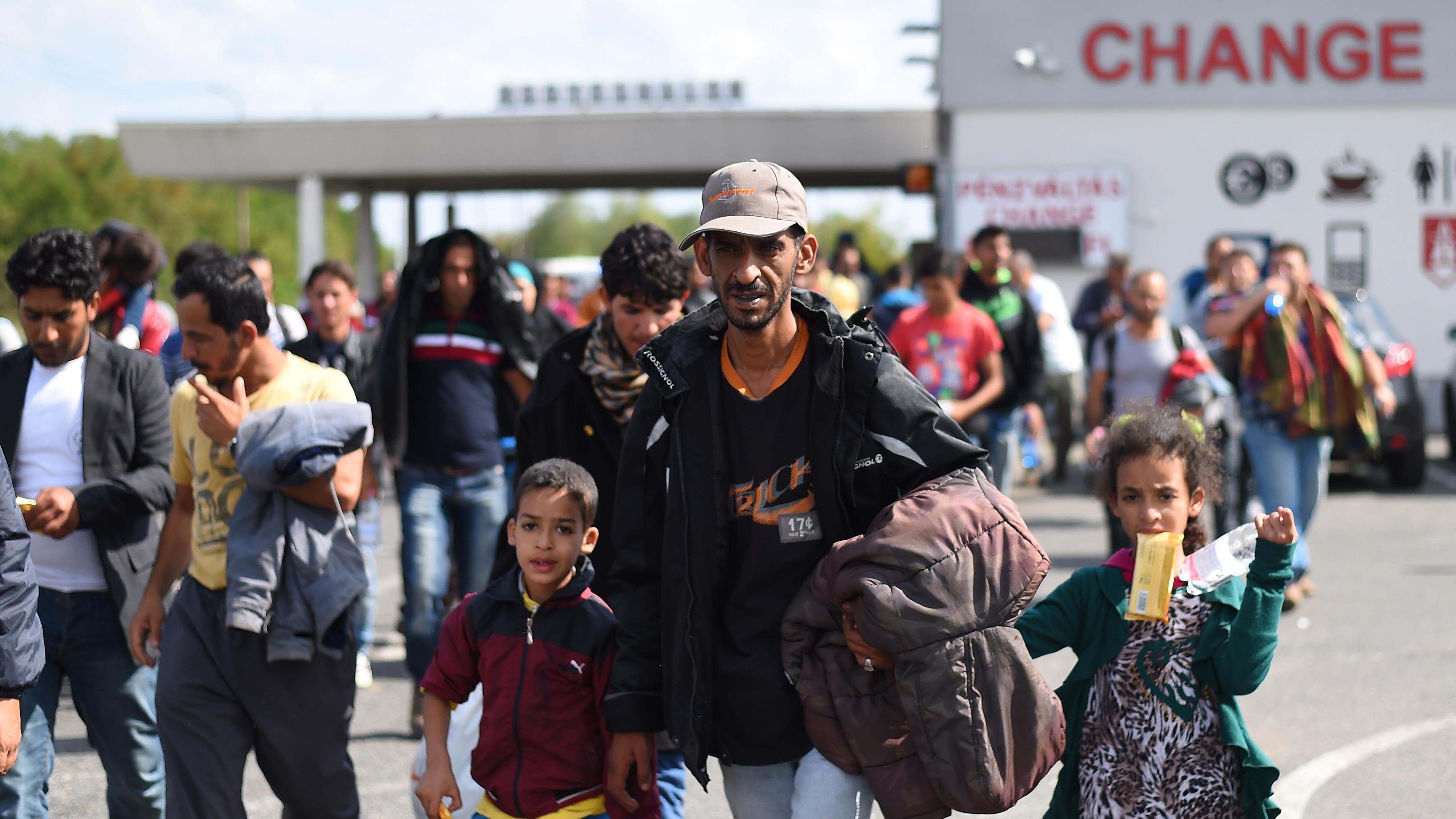 Refugiados sirios desplazados en la frontera de Hungría con Alemania.