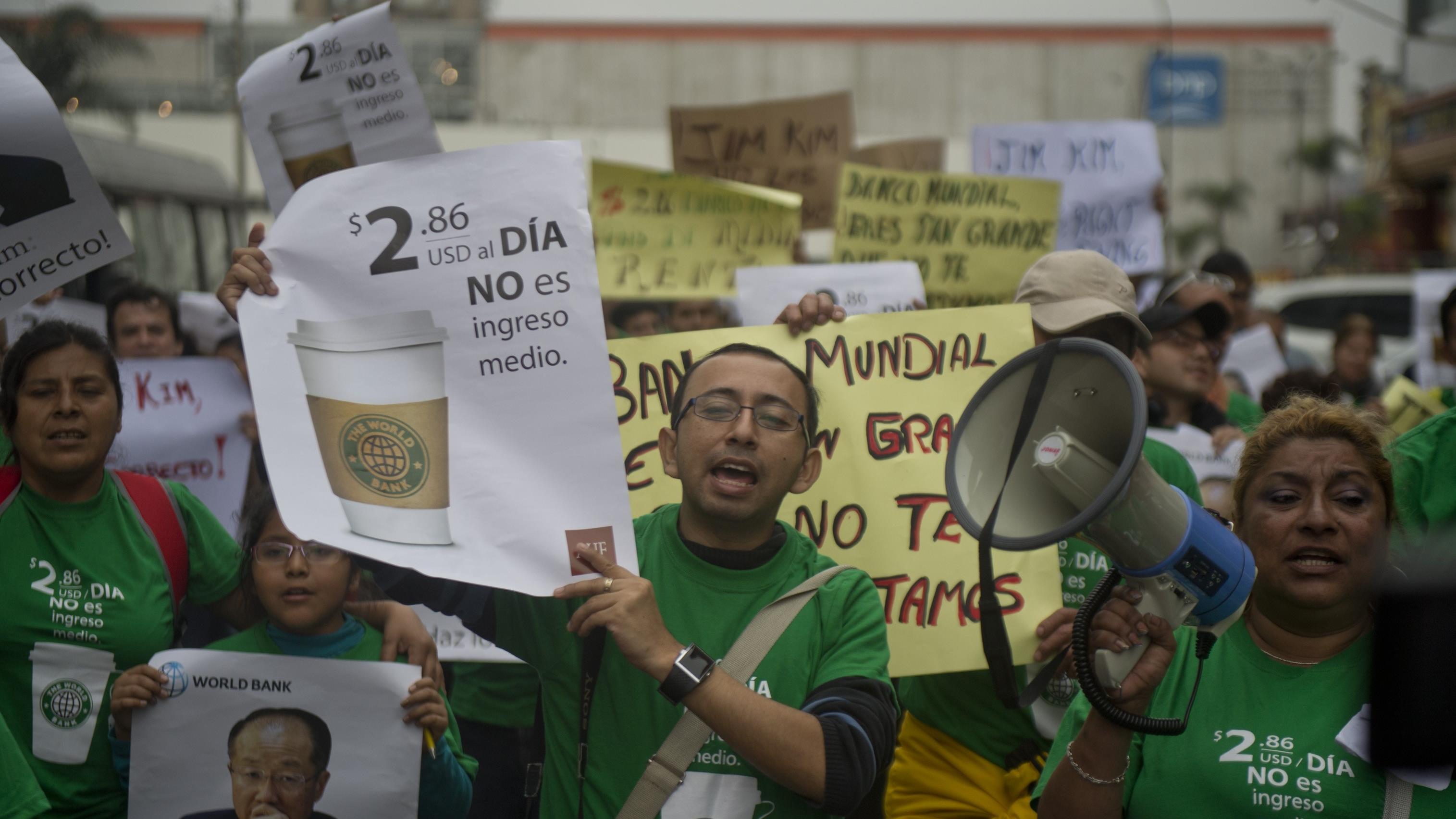 En este contexto, miles de peruanos protagonizaron el viernes una marcha en contra del FMI y el BM al margen de la celebración del encuentro anual de estas dos instituciones en Lima (capital de Perú), gritando lemas como “¡Banco Mundial, terror universal! (...) ¡No más recetas del FMI! (...) ¡El pueblo unido, marcha sin partido!”.