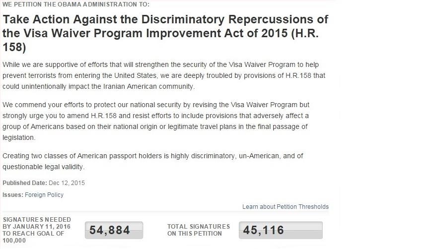 “Estamos profundamente preocupados por las disposiciones de H.R.158 que podrían afectar a la comunidad irano-estadounidense”, dice la petición creada en la página Web de la Casa Blanca.