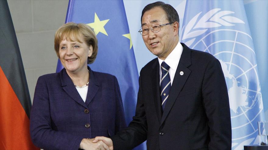 Se trata de una reunión entre el secretario general de la Organización de las Naciones Unidas (ONU), y la canciller alemana, Angela Merkel, en la que discutían maneras para hacer frente al cambio climático, un polémico tema en los últimos años.