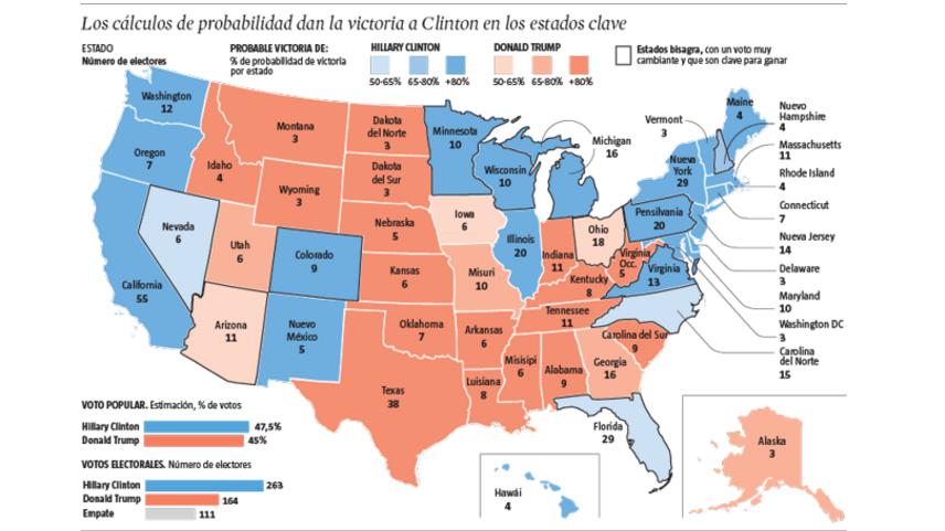 Se considera empate técnico cuando la ventaja de un candidato es menor al margen de error de la encuesta. Clinton sigue por delante de Trump en la mayoría de sondeos, pero su ventaja promedio se ha reducido a 2,5 puntos, si sólo se cuentan los votos de ambos candidatos, o de 2,8%, si también figuran en el sondeo Gary Johnson y Jill Stein, candidatos minoritarios sin posibilidad de ganar, pero capaces de restar a los dos grandes votos decisivos en estados clave.