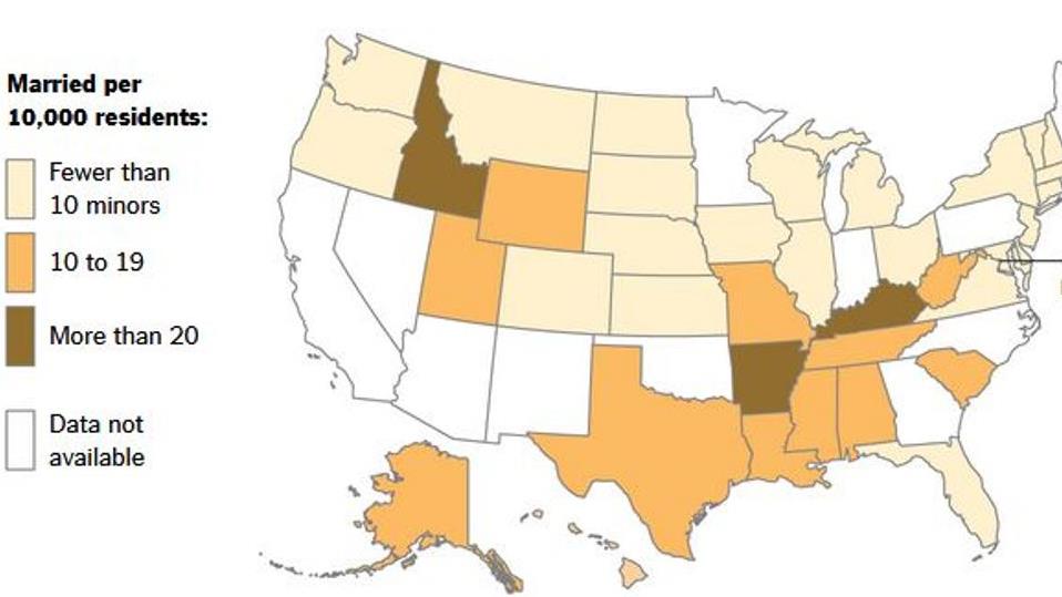 En cada estado estadounidense se autoriza el matrimonio de menores, donde ni siquiera establecen una edad mínima para hacerlo. Arkansas, Idaho y Kentucky son los tres estados en los que se ha registrado la mayor tasa de casamientos de este tipo.