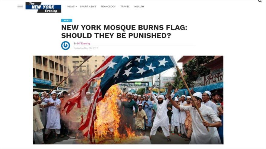 “Una mezquita de Nueva York quema una bandera de Estados Unidos. ¿Deben ser castigados?”, es el titular de la noticia que aparece en el portal The New York Evening, que va acompañado de una imagen de portada en la que un grupo de hombres, aparentemente musulmanes por la ropa que visten, prenden fuego a la bandera estadounidense.