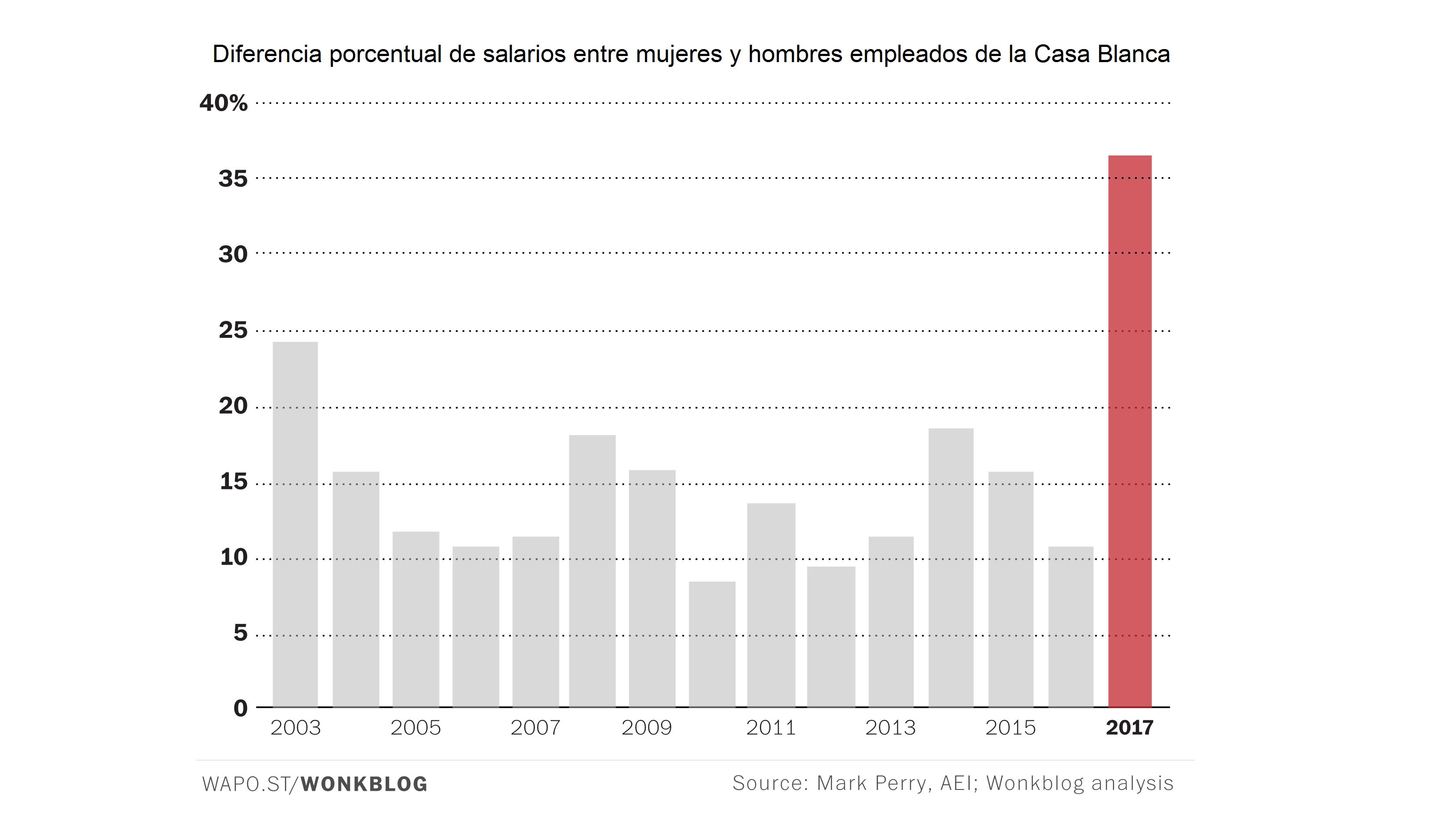 Según el estudio, ya bajo la Administración del presidente Trump la diferencia salarial de género entre los empleados de la Casa Blanca ha llegado a ser de cerca de 37 %, una cifra que supone que se ha triplicado la brecha salarial del género en comparación con el último año de la Administración del expresidente Barack Obama.