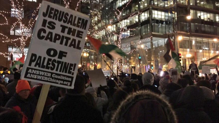 Los indignados manifestantes se congregaron el jueves en la Plaza Federal de la ciudad norteamericana de Chicago (estado de Illinois) con banderas palestinas, mientras gritaban ‘¡Palestina libre!’ y denunciaban el traslado de la embajada de EE.UU. a la ciudad de Al-Quds (Jerusalén).