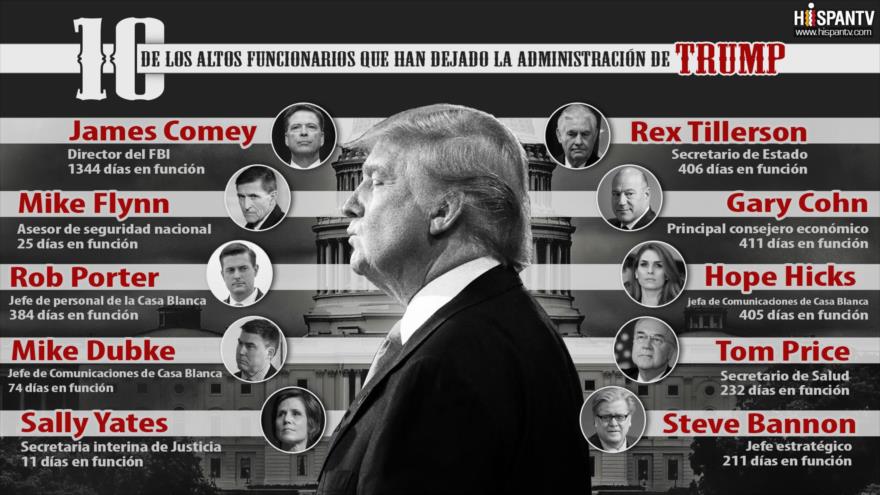 El Gobierno de Trump, que cumple 14 meses en el poder, se ha visto envuelto en turbulencias por numerosos despidos y renuncias voluntarias. La directora de Comunicaciones de la Casa Blanca Hope Hicks y el consejero económico jefe de Trump Gary Cohn fueron los últimos dos funcionarios en renunciar. Los siguió Tillerson.
