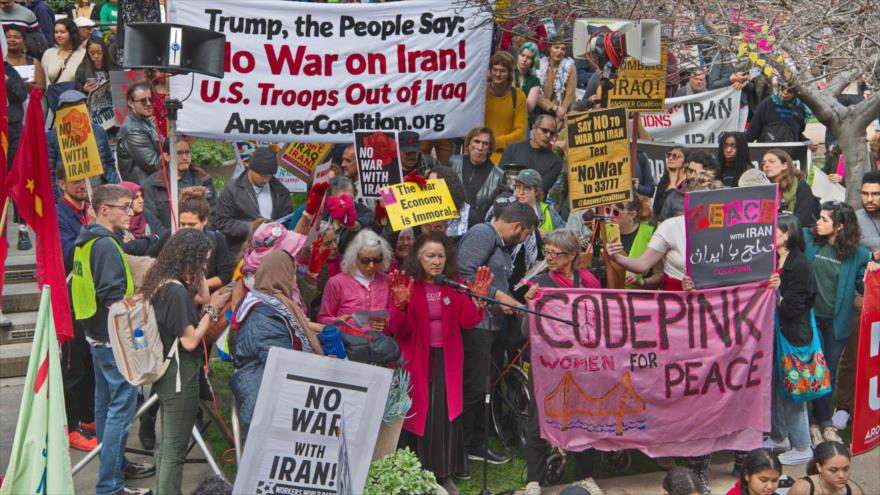 El sábado, una coalición de activistas contra la guerra organizó manifestaciones de protesta en todo Estados Unidos y el mundo para criticar a la Administración Trump por “una escalada peligrosa del conflicto”.