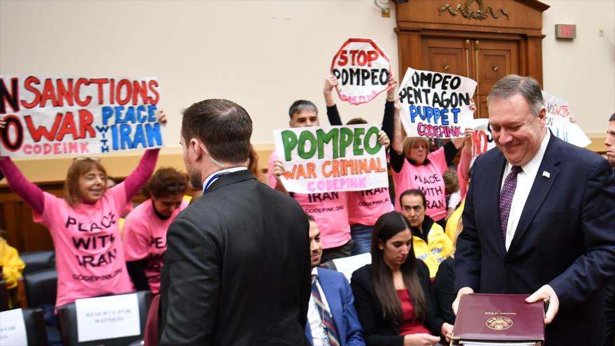 “Pompeo criminal de guerra” y “No a las sanciones a Irán” figuraban entre las pancartas que levantaban los indignados activistas, en cuyas playeras rosas se leía “Paz con Irán”.